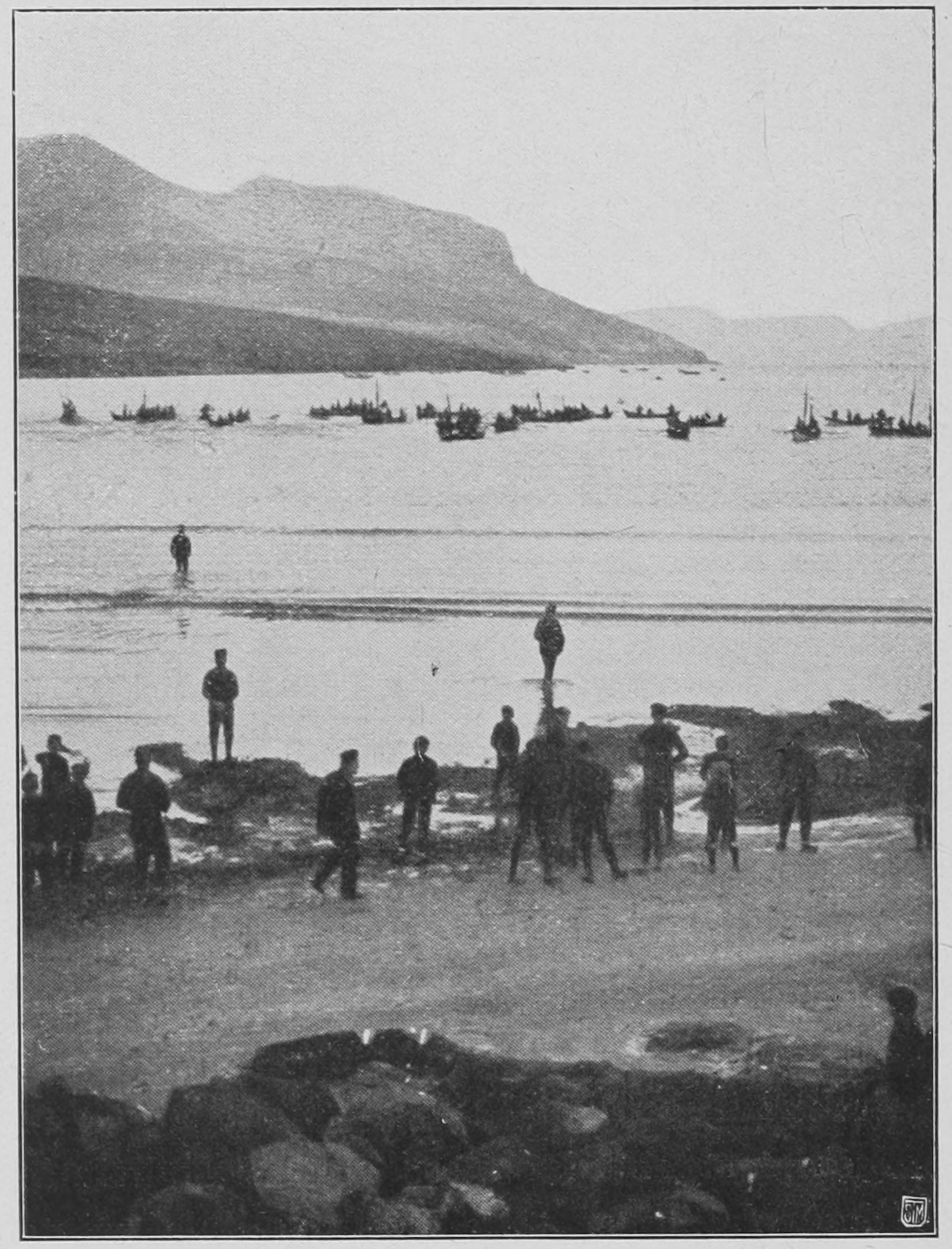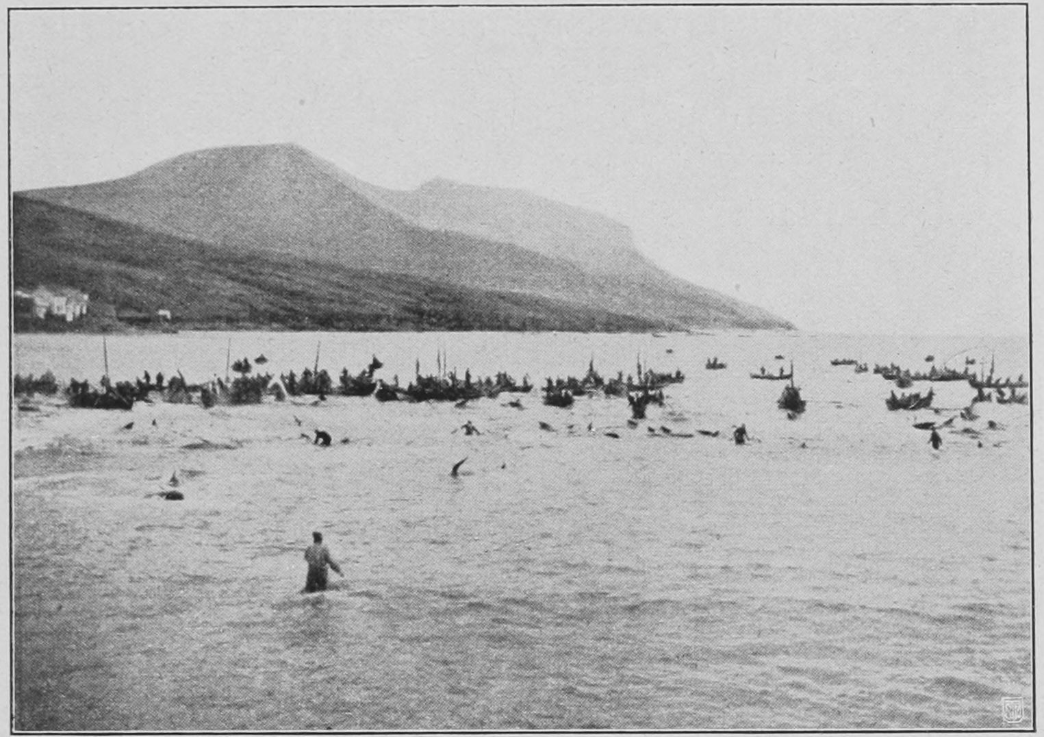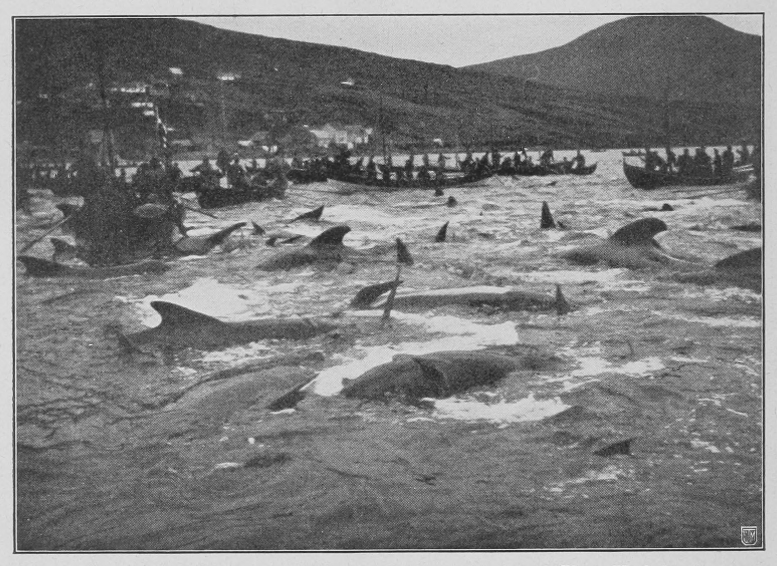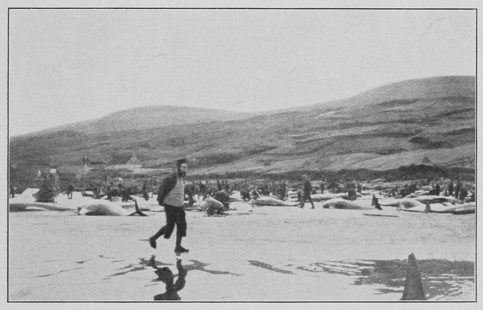 Für die Färinger selbst war der Fang der Großwale nie eine wichtige Angelegenheit. Dagegen sind die im Sommer scharenweise auftretenden Grindwale (Globiceps melas, eine kleine Delphinart) Gegenstand ihrer besonderen Aufmerksamkeit. Ihr in der Tat auch feines und wohlschmeckendes Fleisch ist die beliebteste Nahrung der Färinger, und der Fang eines Schwarms ist eine erfreuliche, feierliche Begebenheit. Der Fischer oder Schiffer, der auf dem Meere einen Schwarm bemerkt, bindet sofort als Signal sein Wams in den Mast hinauf, und dieses Signal verpflanzt sich eilig unter Wahrung vorsichtiger Stille von Boot zu Boot, bis es von der Küste bemerkt und mit Feuer- und Rauchsignalen beantwortet wird. Dieses Feuersignal — ein Überbleibsel der alten „Baune“ der Wikingerzeit – ruft bald alle die Fischer auf dem Lande zusammen; von Haus zu Haus – selbst in die Kirche hinein, wenn gerade Gottesdienst ist – verpflanzt sich die freudige Kunde. Alle Boote werden schnell bemannt und mit den nötigen Geräten, darunter Wurfsteinen und Speeren, versehen. Die Taktik ist nun diese: einen Halbkreis von Booten um die Wale herum zu bilden, der langsam und vorsichtig in möglichster Stille die Tiere gegen eine für den Fall ausersehene flache Bucht, hineintreiben soll. Sobald dаs so weit gelungen ist, daß mаn annehmen kann, daß die Grindwale nicht mehr umkehren wollen, erhebt mаn plötzlich ein Geschrei und macht mit den Rudern und Wurfsteinen möglichst viel Geräusch und Unruhe im Wasser. Die erschrockenen Tiere fliehen dann landwärts und gleiten von selbst auf den Strand hinauf, wo sie dann getötet und zerhauen werden. Der friedfertige Färing wird in diesem Momente grausam, von alter Mordlust ergriffen, von einem Instinkt aus jener Zeit, da auf dieser Jagd sein Wohl und Weh‘ beruhte.