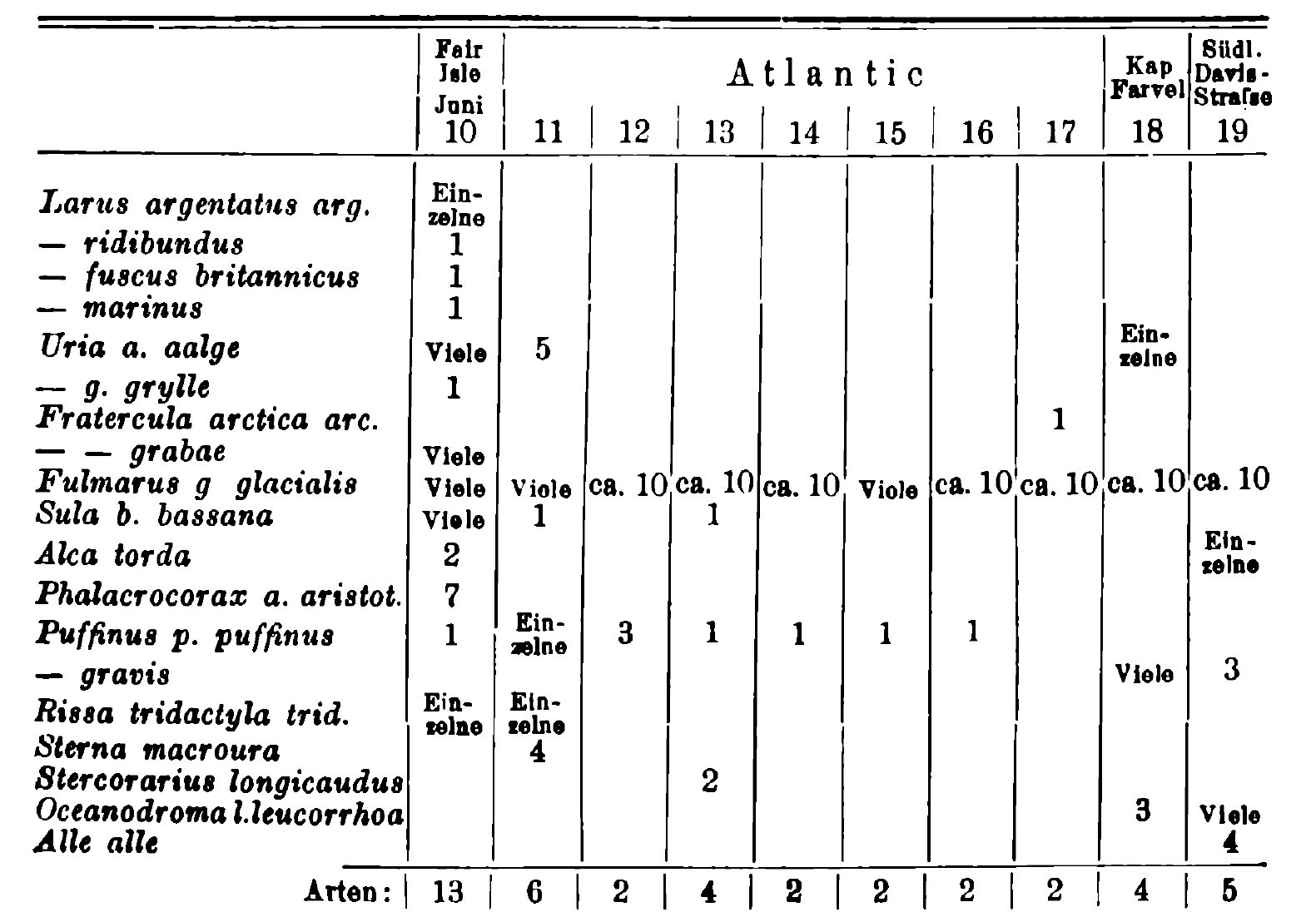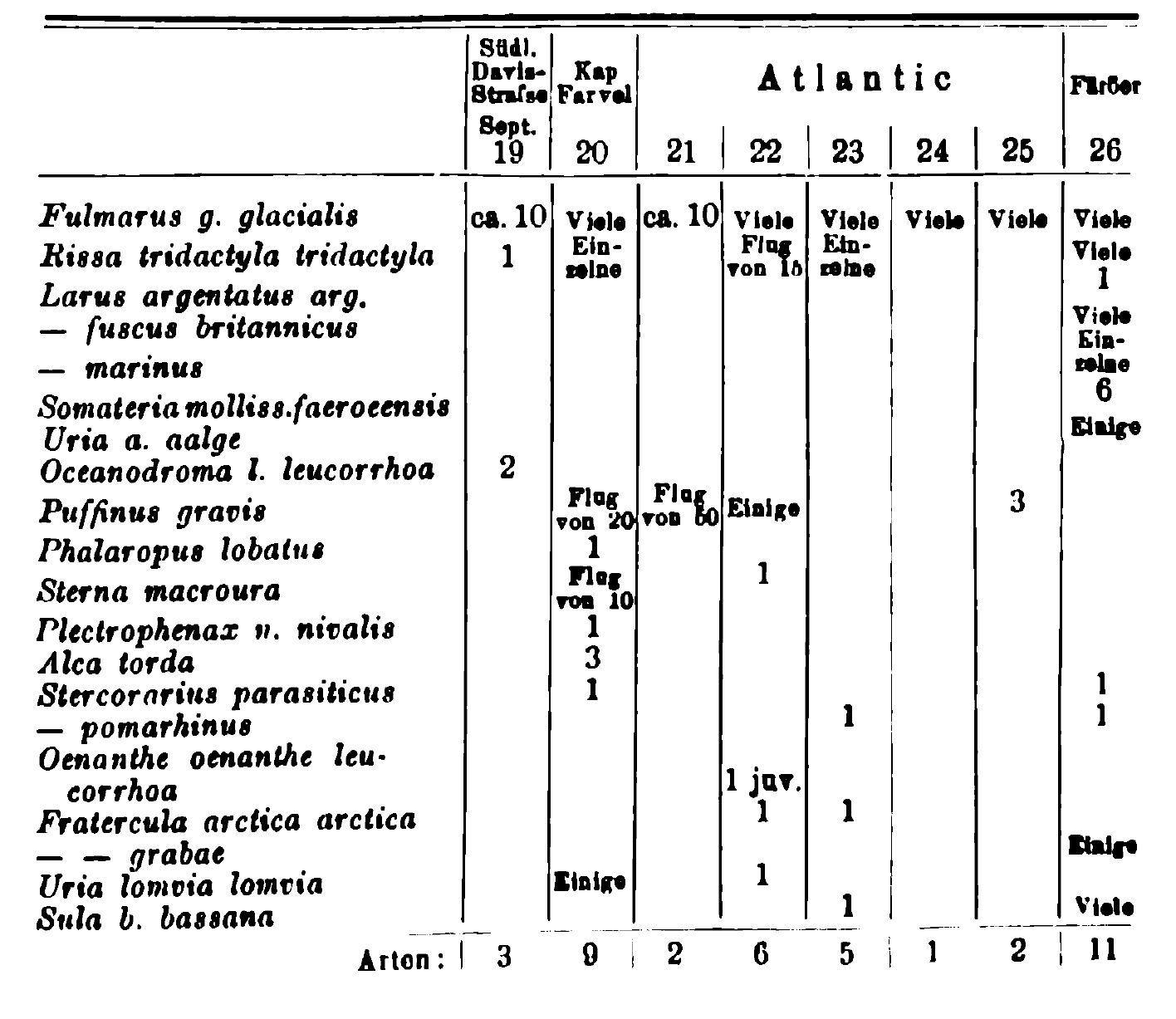 Man sieht, daß die Artenanzahl nicht so konstant ist, sie schwankt etwas, ist im ganzen ein bischen höher. Der Zug der nördlichen Vögel ist daran Schuld. Sterna macroura, Phalaropus lobatus und einige Sperlingsvögel wurden beobachtet, und es ist sehr wahrscheinlich, daß sie auf dem Zuge nach Europa waren. Die kleinen Sperlingsvögel waren sehr erschöpft, und wäre dаs Schiff nicht gekommen, so wären sie ins Wasser gefallen. Auch andere Zugvögel wurden bemerkt, z. B. eine grosse Schar von 50 Puffinus gravis; auch wurden mehrere Alciden sowohl auf der Hin- als auf der Rückreise gesehen. Es schien mir, daß die Hochsee jetzt im Herbst viel belebter als im Frühling war.