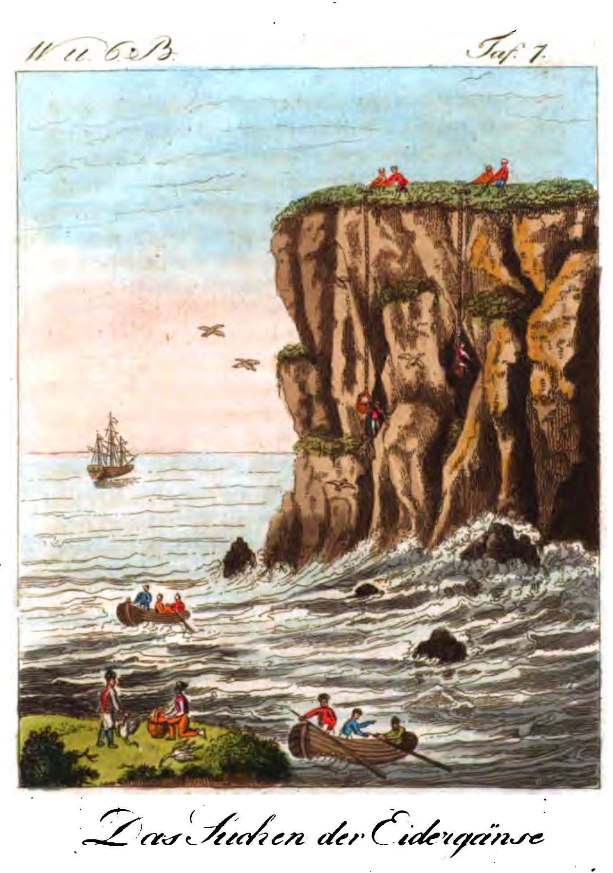 , so verlassen sie dаs Nest, und brüten in diesem Jahre nicht. Diese Federn und Eier sind es nun, welche die Inselbewohner anlocken, die Nester aufzusuchen, denn die Vögel selbst werden, wegen ihres thranigen, fischigen Geschmacks, selten gegessen. Sie besteigen deshalb die steilsten and gefährlichsten Klippen und Felsenspitzen, befestigen daselbst starke Seile, und аn dаs Ende derselben ein Querholz zum sitzen, und lassen sich so аn den Felsenwänden hinab, wo die Nester sind. Viele Menschen kommen dabei ums Leben; sie stürzen von den Klippen herab, und werden entweder zerschmettert, oder ein Raub der Wellen, über welchen sie schweben. Doch schreckt dies traurige Schicksal Andre nicht ab.