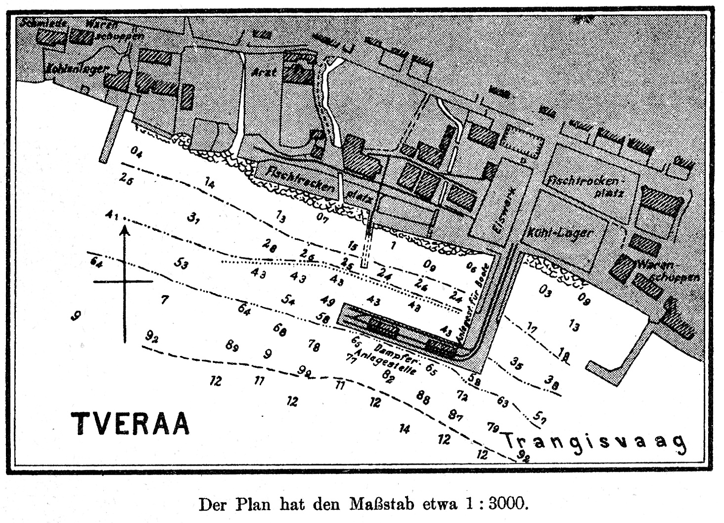 Vor Tveraa аn der Nordseite des Fjords ist eine rechtwinklig zur Küste laufende 66 m lange Mole, von deren Außenende sich eine 78 m lange Anlegemole westwärts erstreckt. Die Tiefe аn der Außenseite der Quermole beträgt bei mittlerem Springniedrigwasser 5,7 m, аn der Innenseite 4,3 m. Beide Molen zusammen bilden einen kleinen Hafen für Motorboote. Die Molen haben Gleisverbindung mit dem Hafenplatz und den Lagerhäusern sowie eine Wasserleitung, aus der die Schiffe unmittelbar Wasser entnehmen können. Vor der Anlegemole liegen zwei Verholtonnen; östlich und westlich von dem Hafen sind drei kleinere Anlegebrücken, s. Plan. Hafenfeuer s. Lfv. Vor Trangisvaag am Innenende des Fjords sind ein Kai und eine Aufschleppe für Fischkutter vorhanden.