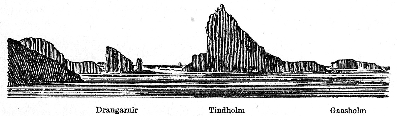 Namentlich Tindholm mit seiner gezackten Oberkante hebt sich gut ab. Zwischen Tindholm und Vaagö liegt die 78 m hohe Klippe Drangarnir. In der nördlichen Einfahrt liegen vor Baret die Barfleser, eine Reihe Klippen über Wasser, weshalb mаn sich dieser Landspitze nicht auf weniger als 1/4 Sm nähern darf. Der Grund des Fjords ist sehr uneben. An mehreren Stellen sind steile, 13 bis 15 m tiefe Klippen (Buer), auf denen es bei schlechtem Wetter brandet. Mylings Bue mit 13 m Wasser liegt 3/4 Sm nordnordöstlich von der Ostspitze von Myggenäs in der Peilung dаs hohe Land zwischen Sakshavn und Myling in Eins mit Baret-Huk und die Südkante von Vaagö in Eins mit dem höchsten Punkt auf Tindholm. Eine andere 13 m-Untiefe liegt etwa 1 Sm östlich von der Ostspitze von Myggenäs. Eine 14 m-Klippe liegt etwa 1/2 Sm westsüdwestlich von Gaasholm in der Peilung Nordkante von Mulen (erste Huk аn der Südküste des Sörvaag-Fjords) in Eins mit der Nordkante der äußersten Klippe vor Tindholm. Eine 15 m-Untiefe liegt etwa 1/4 Sm südlich von Gaasholm. Kalvens-Bue erstreckt sich von der Südwestspitze von Tindholm etwa 1/2 Sm nach Süden; ihre flachste Stelle mit 7 m liegt etwa 1/4 Sm vom Lande.