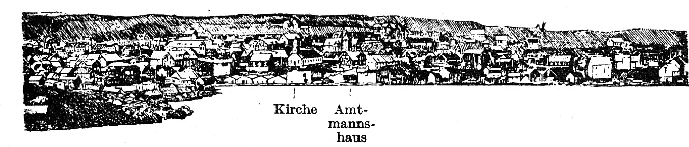 Thorshavn-Stadt hat etwa 3000 Einwohner und ist Landeshauptstadt. Die Stadt ist der Tagungsort des Lagthing, Sitz des höchsten Verwaltungsbeamten (Amtmann) der Färöer und anderer Beamten. Bank, Krankenhaus, Ärzte, Telegraphen- und Fernsprechamt sind am Ort.