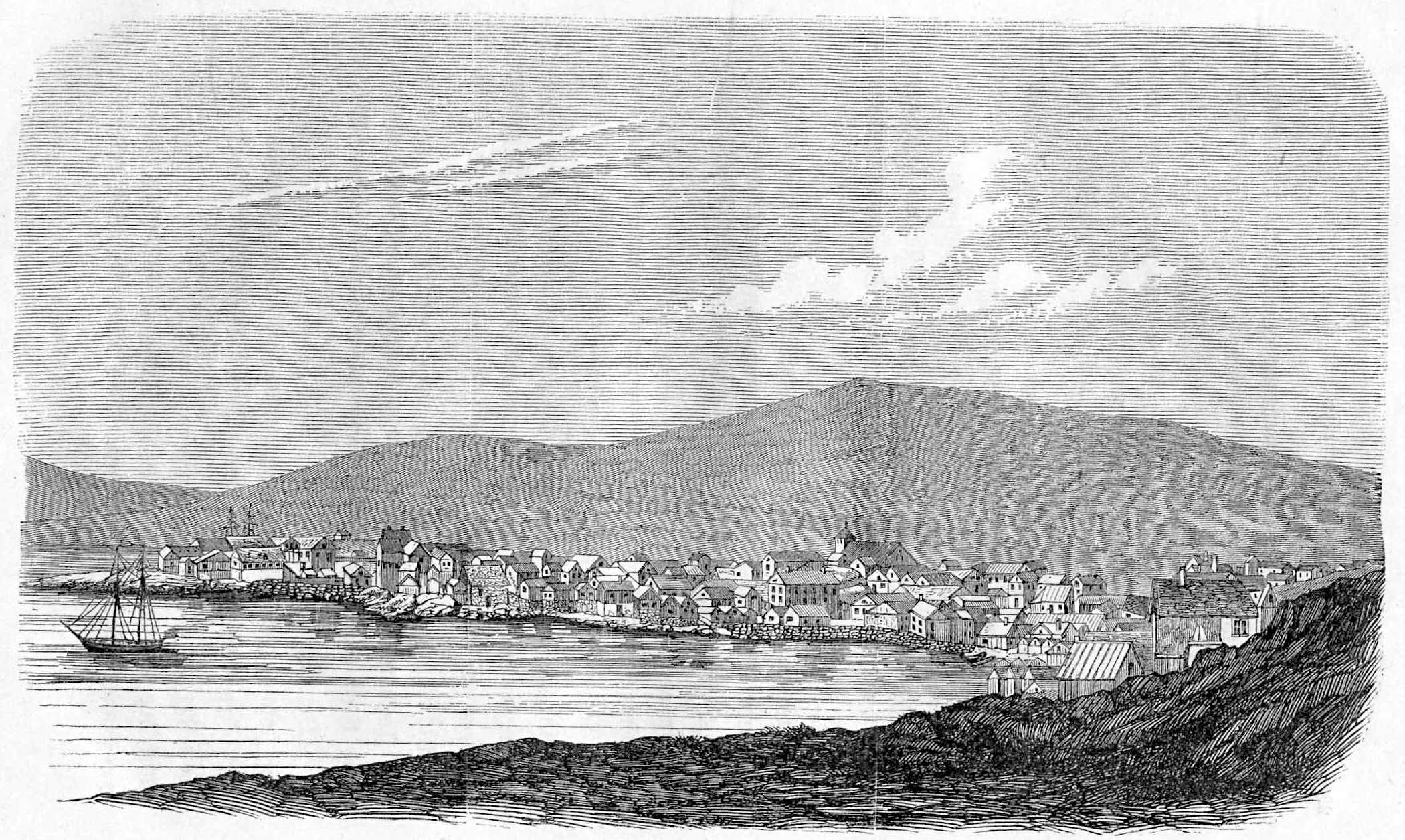 Die Färöerne zählen 8000 Einwohner, gehören zu Dänemark und bilden einen eigenen Regierungsamtsbezirk. Die Orte, welche höchstens aus sieben bis acht Häusern bestehen, liegen in Buchten oder auch hoch über dem felsigen Strande аn den Fuß der Berge hinangebaut. Thorshavn, der Hauptort, liegt auf einer der größern Inseln der nördlichen Gruppe. Der Ort ist auf eine in eine Bucht hinaustretende Felszunge gebaut und scheint in der Ferne mit seinen amphitheatralisch ansteigenden Häusern, Häuschen und Hütten viel ansehnlicher, als er in Wirklichkeit ist. Thorshavn zählt 900 Einwohner, ist der Sitz des Amtmannes, des Richters, des Polizei- und Steuerbeamten, einer Elementarschule und mehrerer Handelsetablissements.