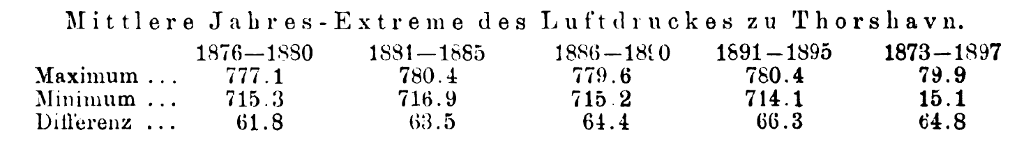 Herr V. Willaume-Jantzen, Subdirektor des Met. / Instituts in Kopenhagen sendete uns einen Separatabzug seines Artikels: Faeröernes Klima aus dem 1.—2. Hefte des 15. Jahrgangs der »Geografisk Tidsskrift«, der uns Veranlassung zur Zusammenstellung der folgenden Tabelle gegeben hat. Dieselbe beruht für die meisten Elemente auf 25-jährigen Beobachtungen (1873—1897). Ausser den in dem genannten Artikel enthaltenen Beobachtungs-Ergebnissen verdanken wir auch brieflichen Mittheilungen des Herrn W.-Jantzen manche klimatische Elemente, so die mittleren Monats- und Jahresextreme der Temperatur, die Zahlen für die relative Häufigkeit der Niederschlagsmengen von gewisser Intensität, die Jahres-Extreme des Luftdruckes 1873—1897.