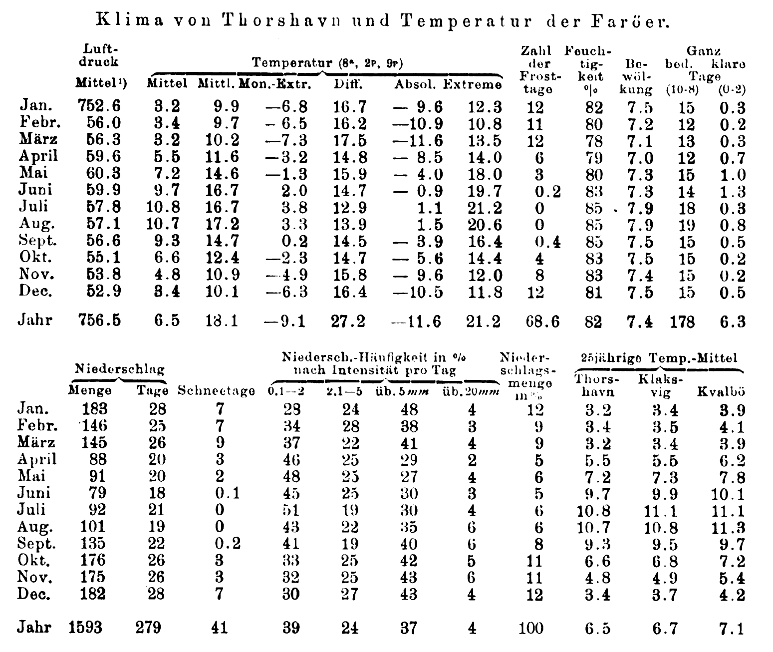 Kvalbö und Klaksvig sind noch wärmer als Thorshavn, am ersteren Orte erreicht der kälteste Monat nahezu 4° Mittelwärme und ist fast so warm als der Januar von Triest. Die Kehrseite des Klimas sind аber die vielen Regentage und die fast beständige Trübung des Himmels. Thorshavn hat 160 cm Niederschlag аn 280 Tagen, d. i. аn 80% der Tage des Jahres: Klaksvig nördlich von Thorshavn hat 170 cm аn 250 Tagen, während Kvalbö blos 115 cm аn 160 Tagen hat. Die mittlere Regenmenge pro Tag zu Thorshavn ist 5.8 mm, 6—7 mm im Januar und September bis December, dagegen 4 — 5 mm von April bis Juni.