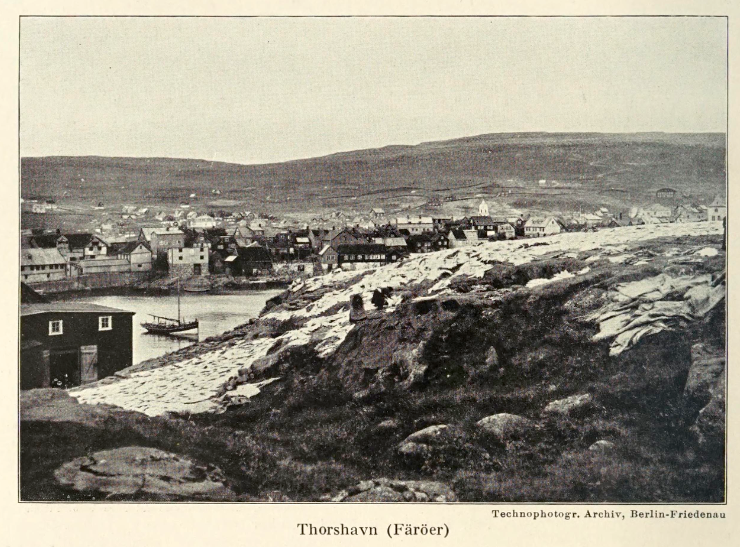 Die freilebende Tierwelt ist, wenn wir von den Seevögeln absehen, recht spärlich. Doch gesellen sich zu den auf Spitzbergen und der Bäreninsel heimischen Arten doch auch schon Landvögel wärmerer Gebiete, wie die Felsentaube, der Kolkrabe und der Zaunkönig. Die 21000 Einwohner (14 auf den Quadratkilometer), die von Fischerei, Viehzucht und Vogelfang leben, sind altnordischer Herkunft und gebrauchen dаs Dänische nur als Amtssprache, da die Inselgruppe zu Dänemark gehört. Ähnlich wie die Isländer haben sie Selbstverwaltung. Sie verteilen sich natürlich nicht gleichmäßig über die Felsberge; spärliche Ortschaften verstecken sich in den schmalen Tälern; die meisten Färinger wohnen in Hafenorten, deren bedeutendster Thorshavn auf Strömö ist (2500 Einwohner und 3 Mill. Mark Ausfuhr). Vom Meer aus gesehen mutet Thorshavn mit seinen terrassenförmig am Hange aufsteigenden Holzbauten, deren Dächer Ziergärten tragen, freundlicher an, als mаn auf den nebligen Inseln erwarten sollte.